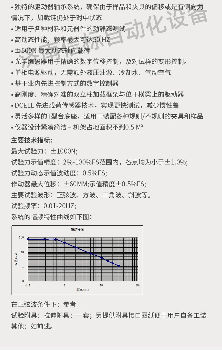 優(yōu)勢特點(diǎn): ?無需油源的直線電機(jī)技術(shù),保證潔凈的測試環(huán)境 ? 軸向通道采用Can總線式控制方式 ? 高速直線作動(dòng)器 ? 獨(dú)特的驅(qū)動(dòng)器軸承系統(tǒng),確保由于樣品和夾具的偏移或是有側(cè)向力情況下,加載鏈仍處于對(duì)中狀態(tài) ? 適用于各種材料和元器件的動(dòng)靜態(tài)測試 ? 高動(dòng)態(tài)性能,頻率最大可達(dá)50 Hz ? ±500N 最大動(dòng)態(tài)軸向載荷 ? 光學(xué)編碼器用于精確的數(shù)字位移控制,及對(duì)試樣的變形控制。 ? 單相電源驅(qū)動(dòng),無需額外液壓油源、冷卻水、氣動(dòng)空氣 ? 基于業(yè)內(nèi)先進(jìn)控制方式的數(shù)字控制器 ? 高剛度、精確對(duì)準(zhǔn)的雙立柱加載框架與位于橫梁上的驅(qū)動(dòng)器 ? Dcell 先進(jìn)載荷傳感器技術(shù),實(shí)現(xiàn)更快測試,減少慣性差 ? 靈活多樣的T型臺(tái)底座,適用于裝配各種規(guī)則/不規(guī)則的夾具和樣品 ? 儀器設(shè)計(jì)緊湊簡潔 – 機(jī)架占地面積不到0.5 m2 優(yōu)勢特點(diǎn): ?無需油源的直線電機(jī)技術(shù),保證潔凈的測試環(huán)境 ? 軸向通道采用Can總線式控制方式 ? 高速直線作動(dòng)器 ? 獨(dú)特的驅(qū)動(dòng)器軸承系統(tǒng),確保由于樣品和夾具的偏移或是有側(cè)向力情況下,加載鏈仍處于對(duì)中狀態(tài) ? 適用于各種材料和元器件的動(dòng)靜態(tài)測試 ? 高動(dòng)態(tài)性能,頻率最大可達(dá)50 Hz ? ±500N 最大動(dòng)態(tài)軸向載荷 ? 光學(xué)編碼器用于精確的數(shù)字位移控制,及對(duì)試樣的變形控制。 ? 單相電源驅(qū)動(dòng),無需額外液壓油源、冷卻水、氣動(dòng)空氣 ? 基于業(yè)內(nèi)先進(jìn)控制方式的數(shù)字控制器 ? 高剛度、精確對(duì)準(zhǔn)的雙立柱加載框架與位于橫梁上的驅(qū)動(dòng)器 ? Dcell 先進(jìn)載荷傳感器技術(shù),實(shí)現(xiàn)更快測試,減少慣性差 ? 靈活多樣的T型臺(tái)底座,適用于裝配各種規(guī)則/不規(guī)則的夾具和樣品 ? 儀器設(shè)計(jì)緊湊簡潔 – 機(jī)架占地面積不到0.5 m2