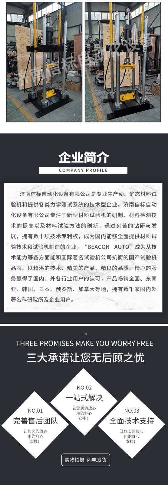 濟南信標自動化設備有限公司主要生產(chǎn):動靜態(tài)萬能疲勞試驗機,接骨板彎曲試驗機,縫合線拉伸疲勞試驗機,髖膝關(guān)節(jié)磨損試驗機,電子萬能試驗機、液壓萬能試驗機、巖石三軸、四軸,電液拉力試驗機,材料試驗機,高低溫蠕變,高低頻疲勞,拉伸、扭轉(zhuǎn)、杯突等二十多個系列兩千多個的品種。