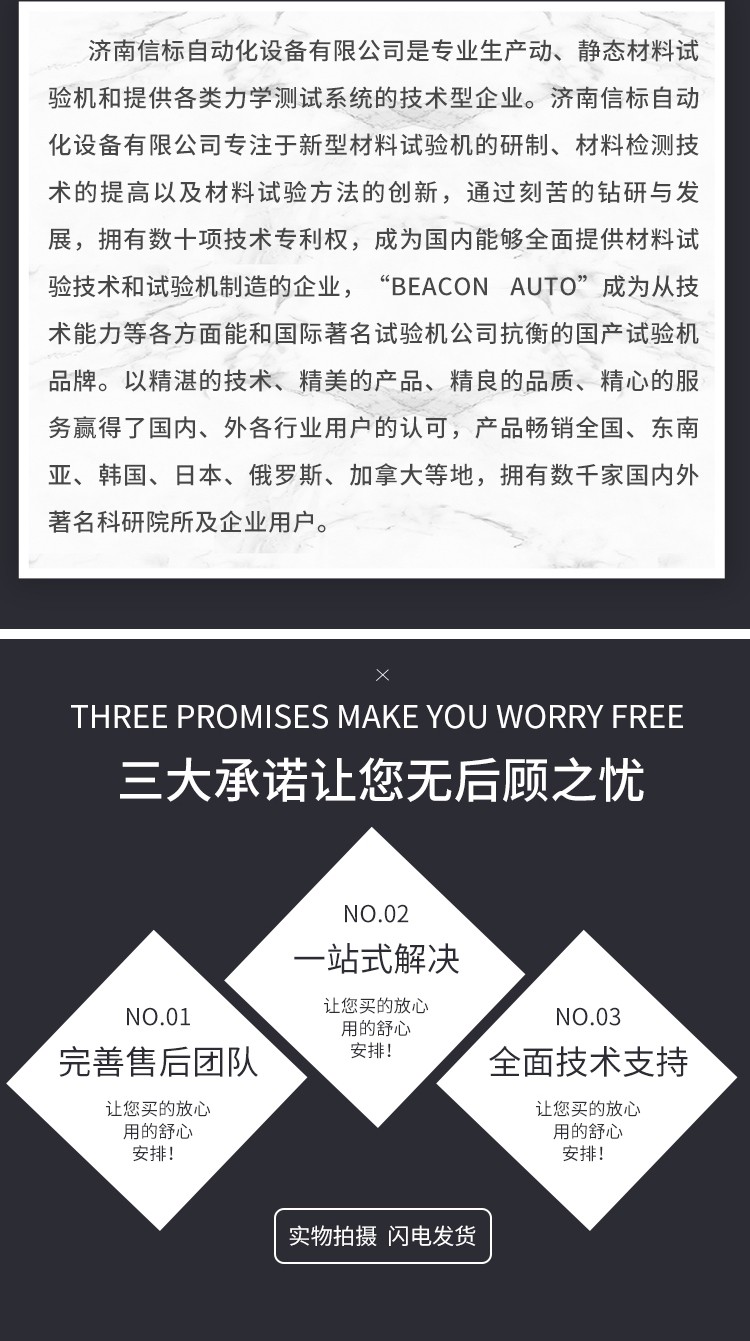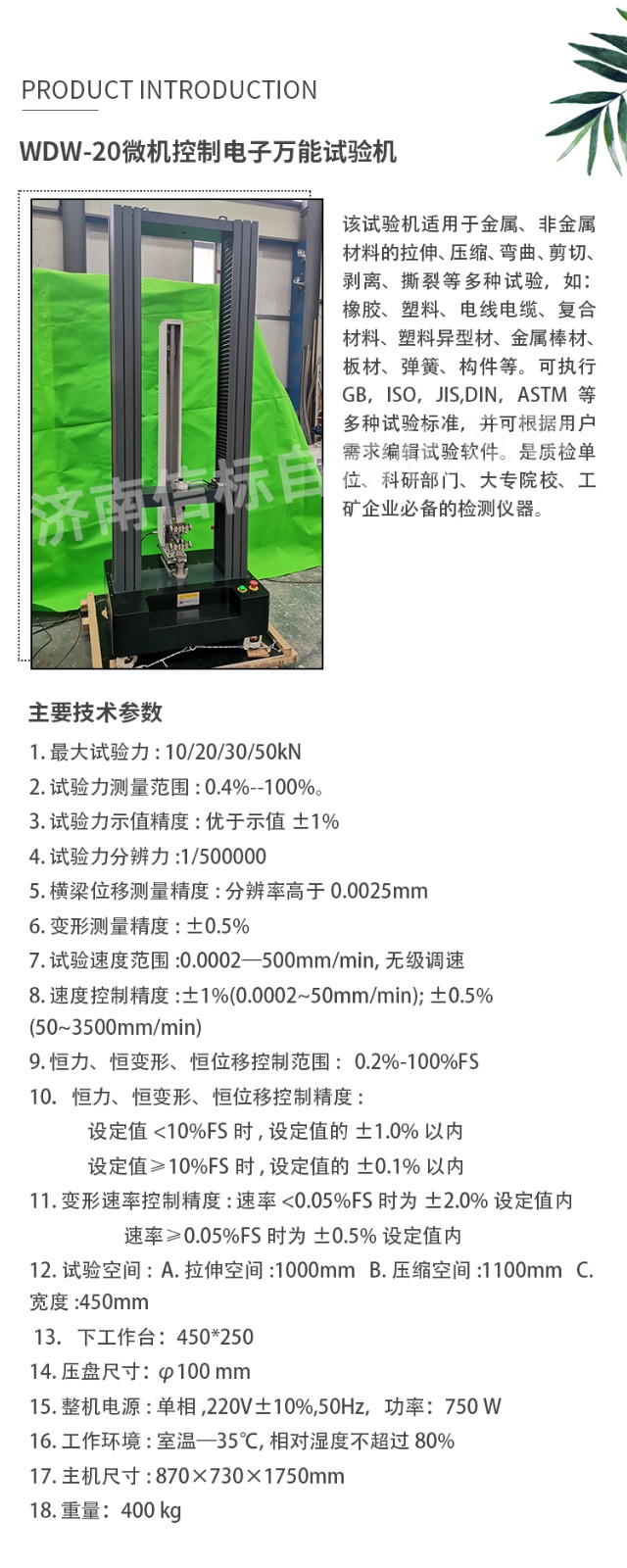 測(cè)量參數(shù): 1. 最大試驗(yàn)力: 10/20/30/50kN 2. 試驗(yàn)力測(cè)量范圍: 0.4%--100%。 3. 試驗(yàn)力示值精度:優(yōu)于示值±1% 4. 試驗(yàn)力分辨力:1/500000 5. 橫梁位移測(cè)量精度:分辨率高于0.0025mm 6. 變形測(cè)量精度: ±0.5% 7. 試驗(yàn)速度范圍:0.0002—500mm/min,無(wú)級(jí)調(diào)速 8. 速度控制精度:±1%(0.0002~50mm/min); ±0.5%(50~3500mm/min) 9. 恒力、恒變形、恒位移控制范圍: 0.2%-100%FS 10.恒力、恒變形、恒位移控制精度: 設(shè)定值<10%FS時(shí),設(shè)定值的±1.0%以內(nèi) 設(shè)定值≥10%FS時(shí),設(shè)定值的±0.1%以內(nèi) 11. 變形速率控制精度: 速率<0.05%FS時(shí)為±2.0%設(shè)定值內(nèi) 速率≥0.05%FS時(shí)為±0.5%設(shè)定值內(nèi) 12. 試驗(yàn)空間: A.拉伸空間:1000mm B.壓縮空間:1100mm C.寬度:450mm 13.下工作臺(tái):450*250 14. 壓盤尺寸:φ100 mm 15. 整機(jī)電源:單相,220V±10%,50Hz,功率:750 W 16. 工作環(huán)境:室溫—35℃,相對(duì)濕度不超過(guò)80% 17. 主機(jī)尺寸: 870×730×1750mm 18. 重量:400 kg 三、產(chǎn)品配置: 1、主機(jī) 一套 2、松下A7全數(shù)字伺服電機(jī)及伺服驅(qū)動(dòng)器; 一套 3、高精度負(fù)荷傳感器; 5kn/1kn/500N/200/ 各一支 4、Hiwin精密滾珠絲杠; 2支 5、光電編碼器(2500線,內(nèi)置); 1支 6、夾具:滿足海綿/汽車座椅所需工裝 1套(有多種) 7、三閉環(huán)測(cè)量系統(tǒng)一套,采用力,位移,應(yīng)變等多種控制方式,試驗(yàn)過(guò)程中可實(shí)時(shí)顯示力-位移,力-時(shí)間,應(yīng)力-應(yīng)變等多種試驗(yàn)曲線,并可自動(dòng)得出最大負(fù)荷,拉伸強(qiáng)度,斷裂伸長(zhǎng)率等多種結(jié)果參數(shù)。 8、HP品牌計(jì)算機(jī),21寸液晶顯示器; 9、打印機(jī):HPA4彩色噴墨打印機(jī); 10、專用試驗(yàn)軟件:可執(zhí)行GB,ISO,JIS、DIN,ASTM等多種試驗(yàn)標(biāo)準(zhǔn),全開放式,功能強(qiáng)大,方便操作,免費(fèi)提供升級(jí)軟件,并可根據(jù)用戶需求自行編輯試驗(yàn)軟件。