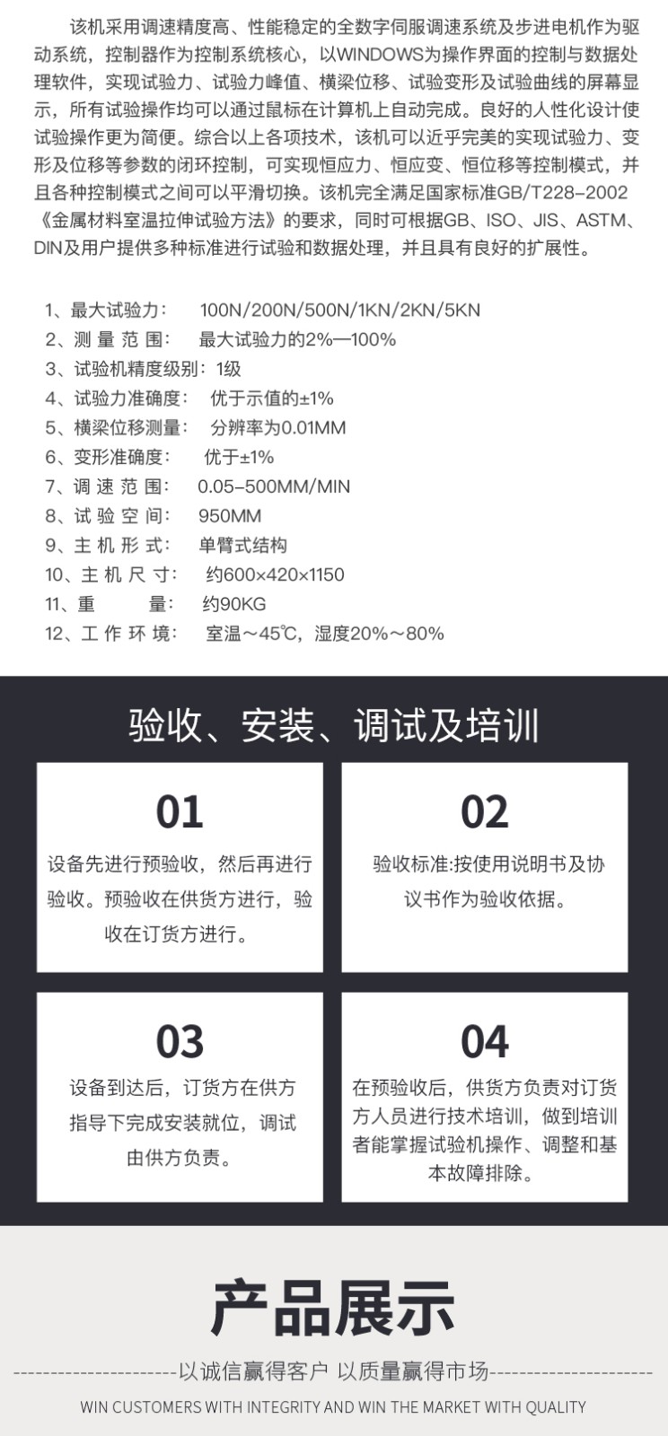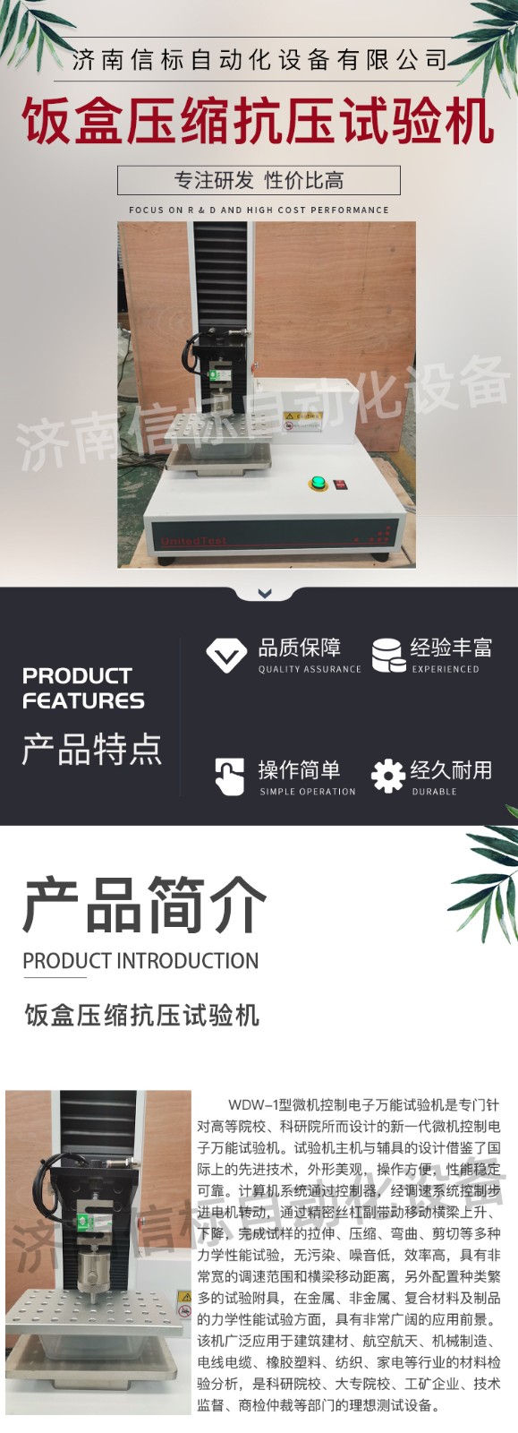 飯盒壓縮抗壓試驗機 單臂壓力萬能試驗機主要技術(shù)指標: 1、 最大試驗力: 100N/200N/500N/1KN/2KN/5KN 2、 測 量 范 圍: 最大試驗力的2%—100% 3、 試驗機精度級別:1級 4、 試驗力準確度: 優(yōu)于示值的±1% 5、 橫梁位移測量: 分辨率為0.01mm 6、 變形準確度: 優(yōu)于±1% 7、 調(diào) 速 范 圍: 0.05-500mm/min 8、 試 驗 空 間: 950mm 9、 主 機 形 式: 單臂式結(jié)構(gòu) 10、 主 機 尺 寸: 約600×420×1150 11、 重 量: 約90Kg 12、 工 作 環(huán) 境: 室溫~45℃,濕度20%~80% 飯盒壓縮抗壓試驗機 單臂壓力萬能試驗機主要功能及特點: 主機: 1.1調(diào)速系統(tǒng)采用伺服電機和自主研發(fā)減速系統(tǒng),性能穩(wěn)定可靠,具有過流、過壓、過載等保護裝置。調(diào)速范圍可達0.05~500mm/min。 1.2傳動部分采用圓弧同步齒形帶,精密絲杠副傳動,傳動平穩(wěn),噪音低,傳動效率高。 1.3萬向節(jié)采用十字插銷結(jié)構(gòu),而且具有擺角限制功能,一方面便于試樣夾持,保證試驗同心度,另一方面很好的消除了不規(guī)則試樣對傳感器的影響。 2、控制系統(tǒng)、操作軟件及數(shù)據(jù)處理系統(tǒng) 2.1計算機控制系統(tǒng),具有集成度高、性能穩(wěn)定、調(diào)整方便等優(yōu)點??梢詫嶒灁?shù)據(jù)進行實時采集,對實驗特性曲線實現(xiàn)實時動態(tài)顯示,試驗數(shù)據(jù)文件能以Access常用數(shù)據(jù)庫或SQLserve大型數(shù)據(jù)庫的方式保存,方便實現(xiàn)客戶的資源共享及網(wǎng)絡管理,以及用戶的再分析。對于用戶自定義的各種word2000報表,該軟件可輕松實現(xiàn)訪問,解決了不同用戶或同一用戶在不同時期對試驗報表有不同需要的難題。該軟件可處理試驗力、位移、 時間、變形的原始數(shù)據(jù)及由此派生的曲線。