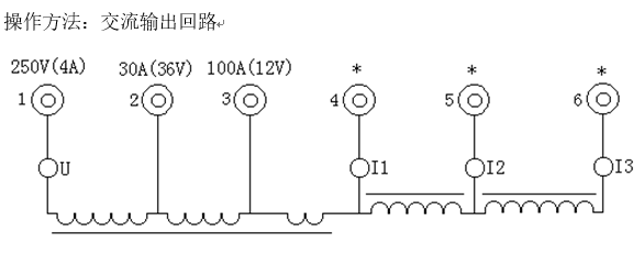 ⑵交流電流0~30A(36V)輸出時(shí),從2與4端子之間輸出,此時(shí)顯示選擇應(yīng)切至“I1”指示燈亮,當(dāng)輸出電流超出40A時(shí),儀器內(nèi)部將自動(dòng)切斷輸出。且內(nèi)部告警,延時(shí)約10秒后將自動(dòng)恢復(fù)輸出。