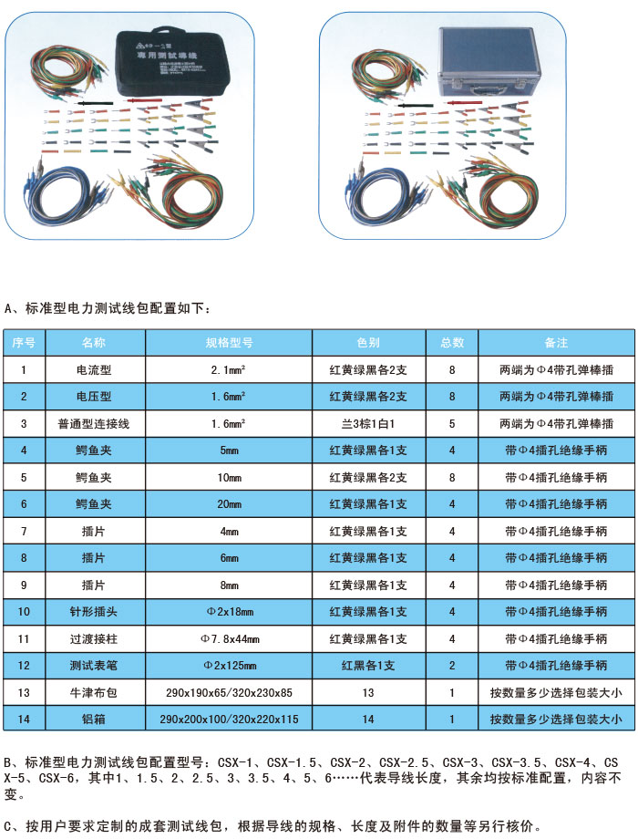 ?CSX系列電力試驗專用測試導(dǎo)線包是電力系統(tǒng)繼電保護專用實驗線,廣泛適用于繼電保護現(xiàn)場、實驗室及其它實驗場所,并同樣適用于儀器儀表進行電氣配套測試等場合。