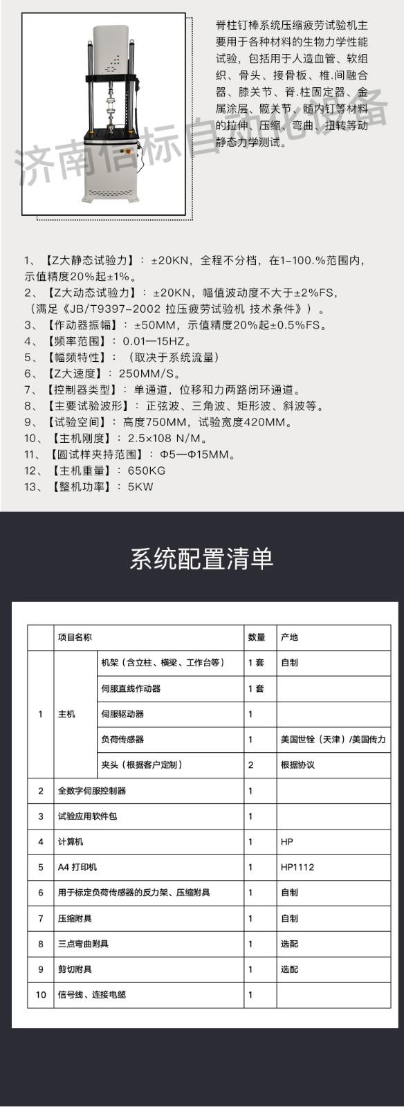 濟(jì)南信標(biāo)自動化設(shè)備有限公司主要生產(chǎn):動靜態(tài)萬能疲勞試驗(yàn)機(jī),接骨板彎曲試驗(yàn)機(jī),縫合線拉伸疲勞試驗(yàn)機(jī),髖膝關(guān)節(jié)磨損試驗(yàn)機(jī),電子萬能試驗(yàn)機(jī)、液壓萬能試驗(yàn)機(jī)、巖石三軸、四軸,電液拉力試驗(yàn)機(jī),材料試驗(yàn)機(jī),高低溫蠕變,高低頻疲勞,拉伸、扭轉(zhuǎn)、杯突等二十多個(gè)系列兩千多個(gè)的品種。