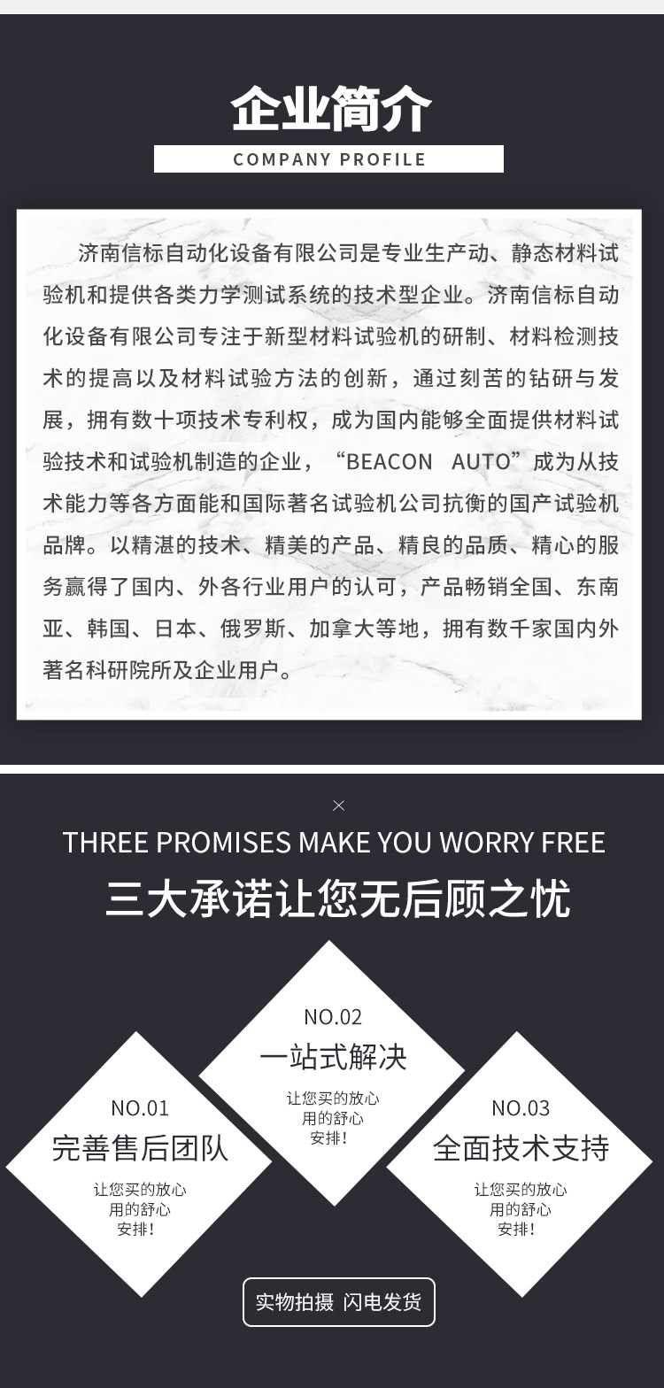 濟南信標自動化設(shè)備有限公司主要生產(chǎn):動靜態(tài)萬能疲勞試驗機,接骨板彎曲試驗機,縫合線拉伸疲勞試驗機,髖膝關(guān)節(jié)磨損試驗機,電子萬能試驗機、液壓萬能試驗機、巖石三軸、四軸,電液拉力試驗機,材料試驗機,高低溫蠕變,高低頻疲勞,拉伸、扭轉(zhuǎn)、杯突等二十多個系列兩千多個的品種。
