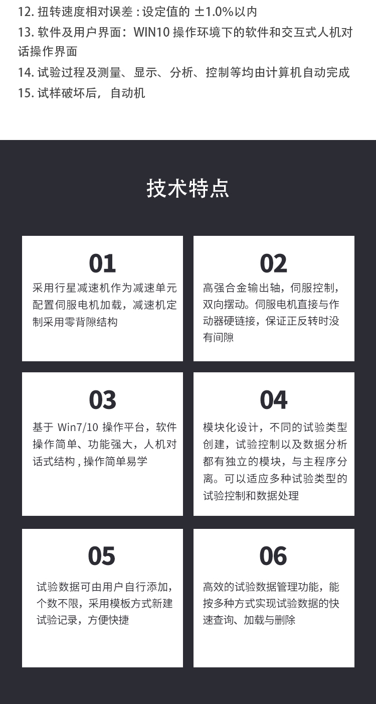 軟件部分: ?基于Win7/10操作平臺,軟件操作簡單、功能強大,人機對話式結(jié)構(gòu)。操作簡單易學(xué) ?軟件采用模塊化設(shè)計,不同的試驗類型創(chuàng)建,試驗控制以及數(shù)據(jù)分析都有獨立的模塊,與主程序分離??梢赃m應(yīng)多種試驗類型的試驗控制和數(shù)據(jù)處理 ?試驗數(shù)據(jù)可由用戶自行添加,個數(shù)不限,采用模板方式新建試驗記錄,方便快捷 ?自動完成試驗過程、判斷破型,自動記錄保存試驗數(shù)據(jù)。所有試驗數(shù)據(jù)以國際通用的XML格式保存 ?高效的試驗數(shù)據(jù)管理功能,能按多種方式實現(xiàn)試驗數(shù)據(jù)的快速查詢、加載與刪除 ?試驗結(jié)束系統(tǒng)自動分析、統(tǒng)計試驗結(jié)果,分析方式可由用戶自行設(shè)定 ?靈活的報表編輯功能,為用戶提供了面向圖形排版的專用報表編輯工具,簡單易學(xué),能方便的打印試驗曲線及相關(guān)圖片、文字 ?用戶可根據(jù)需要對試驗數(shù)據(jù)進行刪除 ?用戶可以根據(jù)需要改變分析方法,數(shù)據(jù)可以根據(jù)本身需要自行修改修約方式 ?專用的數(shù)據(jù)庫管理庫模塊 ?分四檔數(shù)碼顯示試驗力值,精度為每檔量程20%開始示值的±1% ?分四檔數(shù)碼顯示變形,精度為每檔量程20%開始±0.5% ?同時記錄扭矩-時間,扭角-時間、扭矩-扭角、扭矩-轉(zhuǎn)角試驗曲線,可隨時切換觀察,任意放大縮小,水平或垂直移動,實時高速采樣 ?采用人機交互方式分析計算測試材料的機械性能指標(biāo),試驗結(jié)束時系統(tǒng)會自動計算最大扭矩、抗扭強度、上下屈服扭矩、規(guī)定非比例扭矩、切變模量等,在自動分析的基礎(chǔ)上,還可以人工干預(yù)修正分析結(jié)果,提高分析的準(zhǔn)確性
