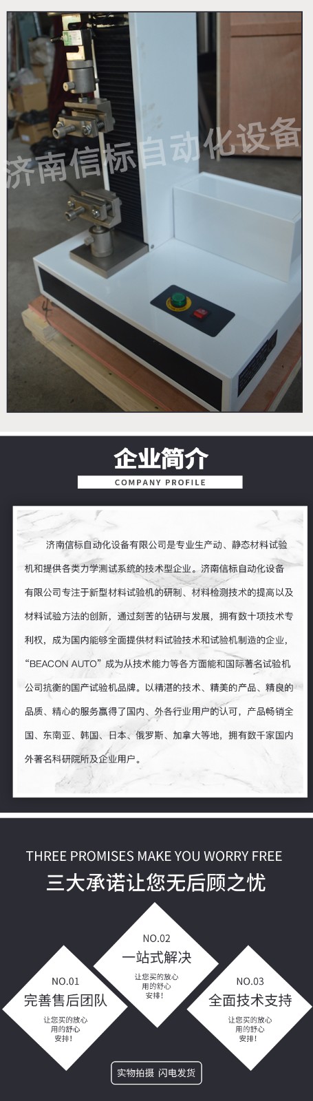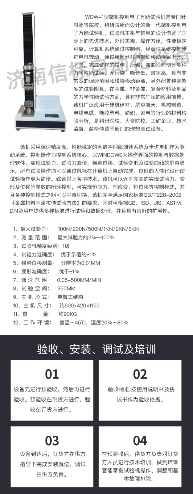 飯盒壓縮抗壓試驗機 單臂壓力萬能試驗機主要技術(shù)指標: 1、 最大試驗力: 100N/200N/500N/1KN/2KN/5KN 2、 測 量 范 圍: 最大試驗力的2%—100% 3、 試驗機精度級別:1級 4、 試驗力準確度: 優(yōu)于示值的±1% 5、 橫梁位移測量: 分辨率為0.01mm 6、 變形準確度: 優(yōu)于±1% 7、 調(diào) 速 范 圍: 0.05-500mm/min 8、 試 驗 空 間: 950mm 9、 主 機 形 式: 單臂式結(jié)構(gòu) 10、 主 機 尺 寸: 約600×420×1150 11、 重 量: 約90Kg 12、 工 作 環(huán) 境: 室溫~45℃,濕度20%~80% 飯盒壓縮抗壓試驗機 單臂壓力萬能試驗機主要功能及特點: 主機: 1.1調(diào)速系統(tǒng)采用伺服電機和自主研發(fā)減速系統(tǒng),性能穩(wěn)定可靠,具有過流、過壓、過載等保護裝置。調(diào)速范圍可達0.05~500mm/min。 1.2傳動部分采用圓弧同步齒形帶,精密絲杠副傳動,傳動平穩(wěn),噪音低,傳動效率高。 1.3萬向節(jié)采用十字插銷結(jié)構(gòu),而且具有擺角限制功能,一方面便于試樣夾持,保證試驗同心度,另一方面很好的消除了不規(guī)則試樣對傳感器的影響。 2、控制系統(tǒng)、操作軟件及數(shù)據(jù)處理系統(tǒng) 2.1計算機控制系統(tǒng),具有集成度高、性能穩(wěn)定、調(diào)整方便等優(yōu)點??梢詫嶒灁?shù)據(jù)進行實時采集,對實驗特性曲線實現(xiàn)實時動態(tài)顯示,試驗數(shù)據(jù)文件能以Access常用數(shù)據(jù)庫或SQLserve大型數(shù)據(jù)庫的方式保存,方便實現(xiàn)客戶的資源共享及網(wǎng)絡(luò)管理,以及用戶的再分析。對于用戶自定義的各種word2000報表,該軟件可輕松實現(xiàn)訪問,解決了不同用戶或同一用戶在不同時期對試驗報表有不同需要的難題。該軟件可處理試驗力、位移、 時間、變形的原始數(shù)據(jù)及由此派生的曲線。