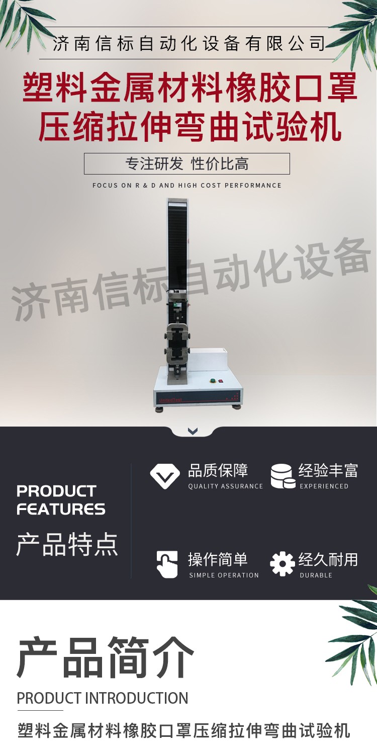 金屬材料壓縮彎曲實(shí)驗(yàn)口罩塑料拉伸強(qiáng)度試驗(yàn)機(jī)主要功能及特點(diǎn): 1、主機(jī): 1.1調(diào)速系統(tǒng)采用伺服電機(jī)和自主研發(fā)減速系統(tǒng),性能穩(wěn)定可靠,具有過流、過壓、過載等保護(hù)裝置。調(diào)速范圍可達(dá)0.05~500mm/min。 1.2傳動(dòng)部分采用圓弧同步齒形帶,精密絲杠副傳動(dòng),傳動(dòng)平穩(wěn),噪音低,傳動(dòng)效率高。 1.3萬向節(jié)采用十字插銷結(jié)構(gòu),而且具有擺角限制功能,一方面便于試樣夾持,保證試驗(yàn)同心度,另一方面很好的消除了不規(guī)則試樣對(duì)傳感器的影響。 2、控制系統(tǒng)、操作軟件及數(shù)據(jù)處理系統(tǒng) 2.1計(jì)算機(jī)控制系統(tǒng),具有集成度高、性能穩(wěn)定、調(diào)整方便等優(yōu)點(diǎn)??梢詫?duì)實(shí)驗(yàn)數(shù)據(jù)進(jìn)行實(shí)時(shí)采集,對(duì)實(shí)驗(yàn)特性曲線實(shí)現(xiàn)實(shí)時(shí)動(dòng)態(tài)顯示,試驗(yàn)數(shù)據(jù)文件能以Access常用數(shù)據(jù)庫或SQLserve大型數(shù)據(jù)庫的方式保存,方便實(shí)現(xiàn)客戶的資源共享及網(wǎng)絡(luò)管理,以及用戶的再分析。對(duì)于用戶自定義的各種word2000報(bào)表,該軟件可輕松實(shí)現(xiàn)訪問,解決了不同用戶或同一用戶在不同時(shí)期對(duì)試驗(yàn)報(bào)表有不同需要的難題。該軟件可處理試驗(yàn)力、位移、時(shí)間、變形的原始數(shù)據(jù)及由此派生的曲線。