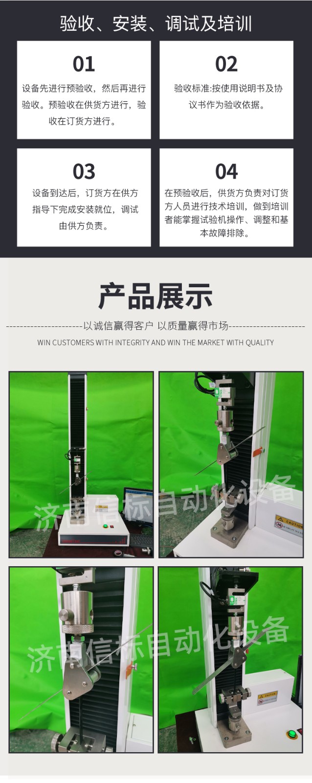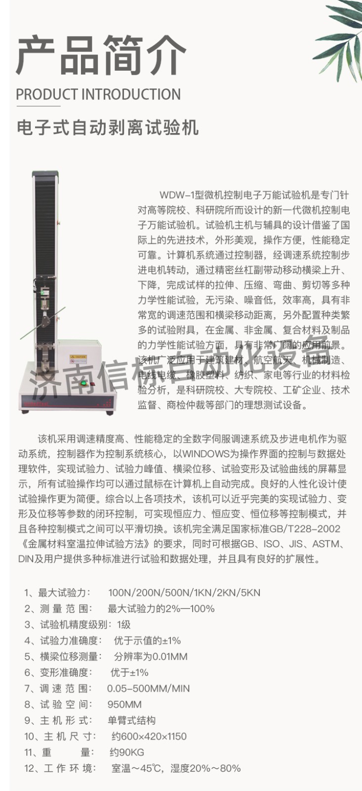 高強(qiáng)度膠黏劑膠帶浮棍法90度180度剝離強(qiáng)度試驗(yàn)機(jī)主要功能及特點(diǎn): 1、主機(jī): 1.1調(diào)速系統(tǒng)采用伺服電機(jī)和自主研發(fā)減速系統(tǒng),性能穩(wěn)定可靠,具有過(guò)流、過(guò)壓、過(guò)載等保護(hù)裝置。調(diào)速范圍可達(dá)0.05~500mm/min。 1.2傳動(dòng)部分采用圓弧同步齒形帶,精密絲杠副傳動(dòng),傳動(dòng)平穩(wěn),噪音低,傳動(dòng)效率高。 1.3萬(wàn)向節(jié)采用十字插銷(xiāo)結(jié)構(gòu),而且具有擺角限制功能,一方面便于試樣夾持,保證試驗(yàn)同心度,另一方面很好的消除了不規(guī)則試樣對(duì)傳感器的影響。 2、控制系統(tǒng)、操作軟件及數(shù)據(jù)處理系統(tǒng) 2.1計(jì)算機(jī)控制系統(tǒng),具有集成度高、性能穩(wěn)定、調(diào)整方便等優(yōu)點(diǎn)??梢詫?duì)實(shí)驗(yàn)數(shù)據(jù)進(jìn)行實(shí)時(shí)采集,對(duì)實(shí)驗(yàn)特性曲線實(shí)現(xiàn)實(shí)時(shí)動(dòng)態(tài)顯示,試驗(yàn)數(shù)據(jù)文件能以Access常用數(shù)據(jù)庫(kù)或SQLserve大型數(shù)據(jù)庫(kù)的方式保存,方便實(shí)現(xiàn)客戶(hù)的資源共享及網(wǎng)絡(luò)管理,以及用戶(hù)的再分析。對(duì)于用戶(hù)自定義的各種word2000報(bào)表,該軟件可輕松實(shí)現(xiàn)訪問(wèn),解決了不同用戶(hù)或同一用戶(hù)在不同時(shí)期對(duì)試驗(yàn)報(bào)表有不同需要的難題。該軟件可處理試驗(yàn)力、位移、時(shí)間、變形的原始數(shù)據(jù)及由此派生的曲線。