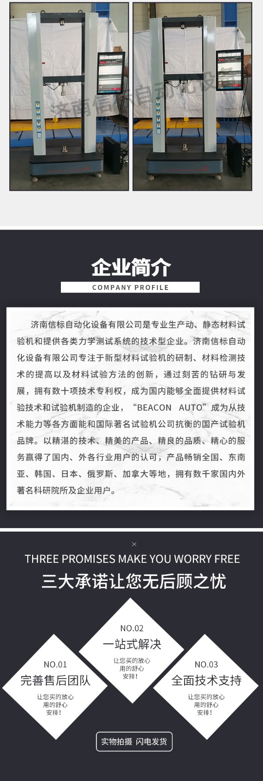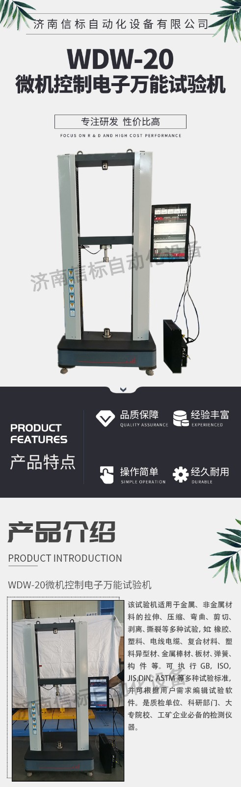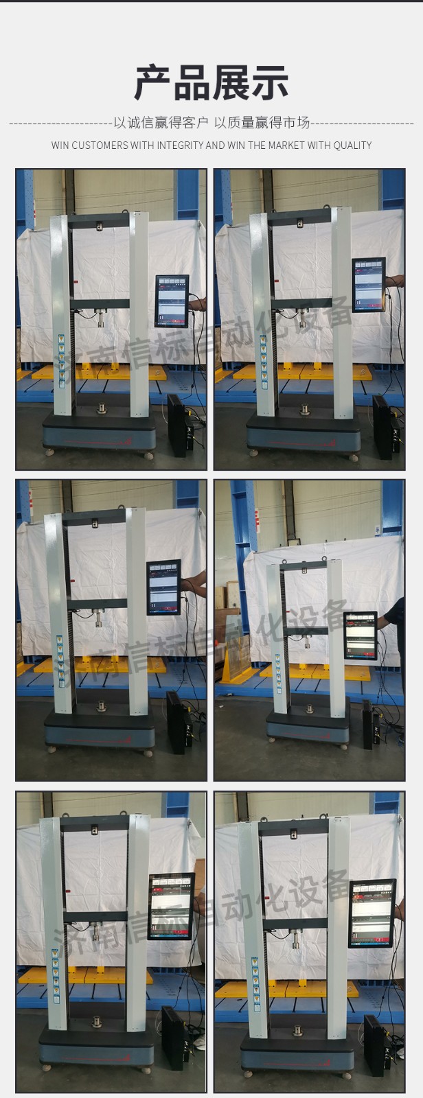 WDW-20微機(jī)控制電子萬(wàn)能試驗(yàn)機(jī)材料抗拉強(qiáng)度拉伸測(cè)試儀器測(cè)量參數(shù): 1. 最大試驗(yàn)力: 10/20/30/50kN 2. 試驗(yàn)力測(cè)量范圍: 0.4%--100%。 3. 試驗(yàn)力示值精度:優(yōu)于示值±1% 4. 試驗(yàn)力分辨力:1/500000 5. 橫梁位移測(cè)量精度:分辨率高于0.0025mm 6. 變形測(cè)量精度: ±0.5% 7. 試驗(yàn)速度范圍:0.0002—500mm/min,無(wú)級(jí)調(diào)速 8. 速度控制精度:±1%(0.0002~50mm/min); ±0.5%(50~3500mm/min) 9. 恒力、恒變形、恒位移控制范圍: 0.2%-100%FS 10.恒力、恒變形、恒位移控制精度: 設(shè)定值<10%FS時(shí),設(shè)定值的±1.0%以內(nèi) 設(shè)定值≥10%FS時(shí),設(shè)定值的±0.1%以內(nèi) 11. 變形速率控制精度: 速率<0.05%FS時(shí)為±2.0%設(shè)定值內(nèi) 速率≥0.05%FS時(shí)為±0.5%設(shè)定值內(nèi) 12. 試驗(yàn)空間: A.拉伸空間:1000mm B.壓縮空間:1100mm C.寬度:450mm 13.下工作臺(tái):450*250 14. 壓盤尺寸:φ100 mm 15. 整機(jī)電源:單相,220V±10%,50Hz,功率:750 W 16. 工作環(huán)境:室溫—35℃,相對(duì)濕度不超過(guò)80% 17. 主機(jī)尺寸: 870×730×1750mm 18. WDW-20微機(jī)控制電子萬(wàn)能試驗(yàn)機(jī)材料抗拉強(qiáng)度拉伸測(cè)試儀器重量:400 kg WDW-20微機(jī)控制電子萬(wàn)能試驗(yàn)機(jī)材料抗拉強(qiáng)度拉伸測(cè)試儀器產(chǎn)品配置: 1、主機(jī) 一套 2、松下A7全數(shù)字伺服電機(jī)及伺服驅(qū)動(dòng)器; 一套 3、高精度負(fù)荷傳感器; 5kn/1kn/500N/200/ 各一支 4、Hiwin精密滾珠絲杠; 2支 5、光電編碼器(2500線,內(nèi)置); 1支 6、夾具:滿足海綿/汽車座椅所需工裝 1套(有多種) 7、三閉環(huán)測(cè)量系統(tǒng)一套,采用力,位移,應(yīng)變等多種控制方式,試驗(yàn)過(guò)程中可實(shí)時(shí)顯示力-位移,力-時(shí)間,應(yīng)力-應(yīng)變等多種試驗(yàn)曲線,并可自動(dòng)得出最大負(fù)荷,拉伸強(qiáng)度,斷裂伸長(zhǎng)率等多種結(jié)果參數(shù)。 8、HP品牌計(jì)算機(jī),21寸液晶顯示器; 9、打印機(jī):HPA4彩色噴墨打印機(jī); 10、專用試驗(yàn)軟件:可執(zhí)行GB,ISO,JIS、DIN,ASTM等多種試驗(yàn)標(biāo)準(zhǔn),全開放式,功能強(qiáng)大,方便操作,免費(fèi)提供升級(jí)軟件,并可根據(jù)用戶需求自行編輯試驗(yàn)軟件。