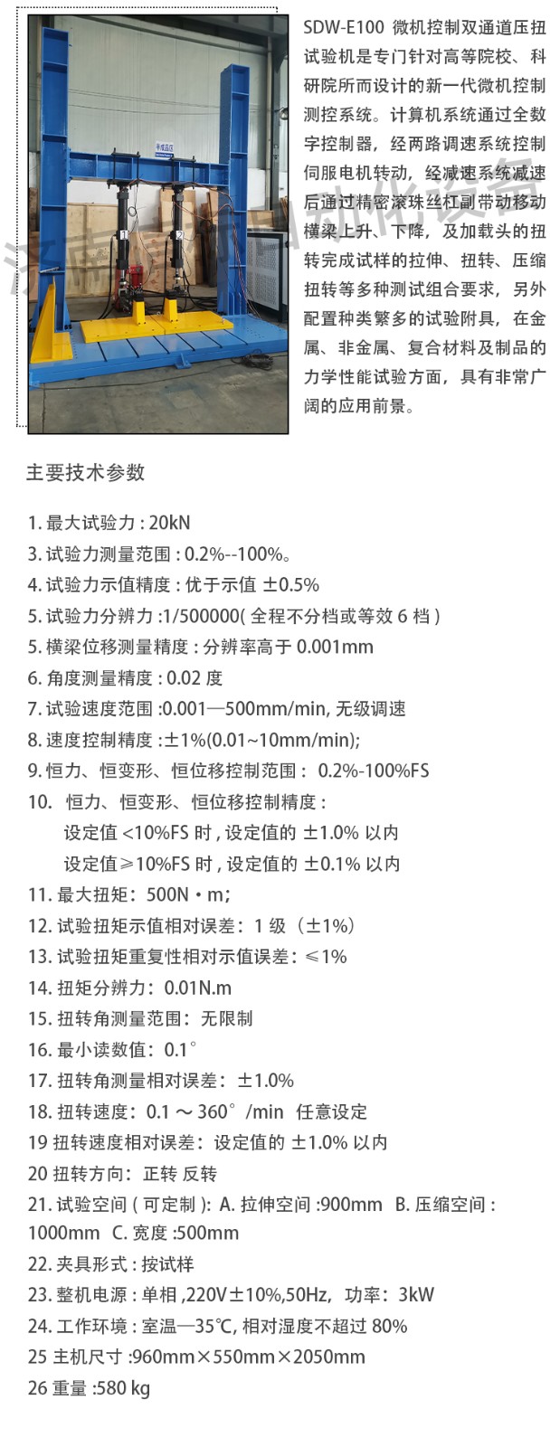 主要技術(shù)指標(biāo): 1. 最大試驗(yàn)力: 20kN 3. 試驗(yàn)力測(cè)量范圍: 0.2%--100%。 4. 試驗(yàn)力示值精度:優(yōu)于示值±0.5% 5. 試驗(yàn)力分辨力:1/500000(全程不分檔或等效6檔) 5. 橫梁位移測(cè)量精度:分辨率高于0.001mm 6. 角度測(cè)量精度: 0.02度 7. 試驗(yàn)速度范圍:0.001—500mm/min,無(wú)級(jí)調(diào)速 8. 速度控制精度:±1%(0.01~10mm/min); 9. 恒力、恒變形、恒位移控制范圍: 0.2%-100%FS 10.恒力、恒變形、恒位移控制精度: 設(shè)定值<10%FS時(shí),設(shè)定值的±1.0%以內(nèi) 設(shè)定值≥10%FS時(shí),設(shè)定值的±0.1%以內(nèi) 11.最大扭矩:500N·m; 12.試驗(yàn)扭矩示值相對(duì)誤差:1級(jí)(±1%) 13.試驗(yàn)扭矩重復(fù)性相對(duì)示值誤差:≤1% 14.扭矩分辨力:0.01N.m 15.扭轉(zhuǎn)角測(cè)量范圍:無(wú)限制 16.最小讀數(shù)值:0.1° 17.扭轉(zhuǎn)角測(cè)量相對(duì)誤差:±1.0% 18.扭轉(zhuǎn)速度:0.1~360°/min 任意設(shè)定 19.扭轉(zhuǎn)速度相對(duì)誤差:設(shè)定值的±1.0%以內(nèi) 20.扭轉(zhuǎn)方向:正轉(zhuǎn) 反轉(zhuǎn) 21. 試驗(yàn)空間(可定制): A.拉伸空間:900mm B.壓縮空間:1000mm C.寬度:500mm 22. 夾具形式: 按試樣 23. 整機(jī)電源:單相,220V±10%,50Hz,功率:3kW 24. 工作環(huán)境:室溫—35℃,相對(duì)濕度不超過(guò)80% 25 主機(jī)尺寸:960mm×550mm×2050mm 26 重量:580 kg 主機(jī) 1.1主機(jī)采用高鋼度框架結(jié)構(gòu),強(qiáng)度高、變形小; 1.2 采用進(jìn)口高精度滾珠絲杠,傳動(dòng)高效平穩(wěn); 1.3 傳動(dòng)部分采用圓弧齒同步帶傳動(dòng),傳動(dòng)過(guò)程中雙向無(wú)間隙; 1.4 采用交流伺服電機(jī)及驅(qū)動(dòng)系統(tǒng),確保傳動(dòng)平穩(wěn),力矩穩(wěn)定,具有過(guò)流、過(guò)壓、過(guò)載等保護(hù)裝置,調(diào)速比可達(dá)1:100000; 1.5 夾具經(jīng)特殊設(shè)計(jì),夾持牢固,操作方便,無(wú)鉗口滑移現(xiàn)象; 1.6 特殊工藝保證試驗(yàn)機(jī)同軸度,很好的消除了不規(guī)則試樣對(duì)傳感器的影響。 1.7NMRV高精度減速機(jī),零背隙保證正反轉(zhuǎn)沒(méi)有間隙 1.8防耦合反力架,保證壓縮和扭轉(zhuǎn)時(shí)兩路傳感器互不影響。