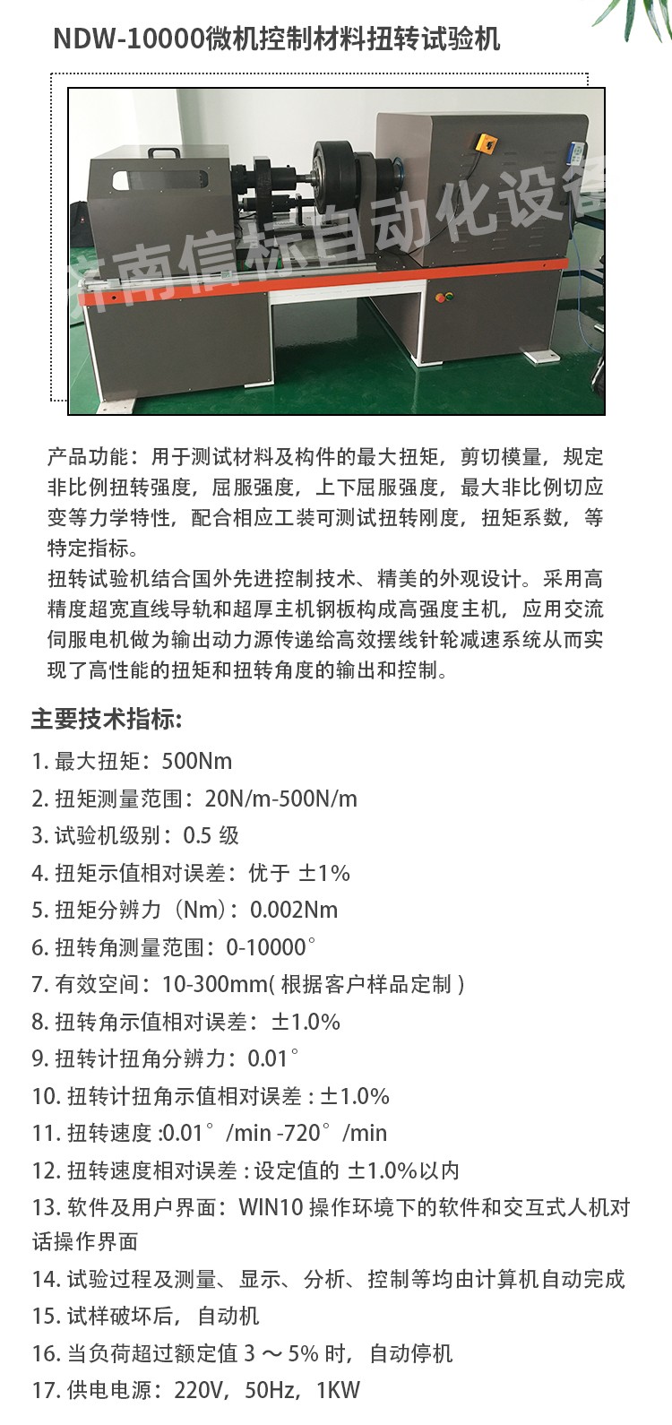 滿足及參考標(biāo)準(zhǔn): 1. GB/T2611-2007《試驗機(jī)通用技術(shù)要求》 2. GB/T10128-1998/2007 《金屬室溫扭轉(zhuǎn)試驗方法》 3. ISO7800-2003金屬材料單軸扭轉(zhuǎn)試驗方法 4. ASTM A 938-2004金屬線扭轉(zhuǎn)試驗方法 5. ASTM A938-07 鋼絲扭轉(zhuǎn)試驗的試驗方法 用于測試材料及構(gòu)件的最大扭矩,剪切模量,規(guī)定非比例扭轉(zhuǎn)強(qiáng)度,屈服強(qiáng)度,上下屈服強(qiáng)度,最大非比例切應(yīng)變等力學(xué)特性,配合相應(yīng)工裝可測試扭轉(zhuǎn)剛度,扭矩系數(shù),等特定指標(biāo)。 構(gòu)成高強(qiáng)度主機(jī),應(yīng)用交流伺服電機(jī)做為輸出動力源傳遞給高效擺線針輪減速系統(tǒng)從而實現(xiàn)了高性能的扭矩和扭轉(zhuǎn)角度的輸出和控制。 控制系統(tǒng)采用世界流行的高速PCIE標(biāo)準(zhǔn)并行總線設(shè)計,采用美國BB公司放大器,AD公司的高速模數(shù)轉(zhuǎn)換器及CPLD構(gòu)成數(shù)據(jù)采集系統(tǒng)及高精度扭矩傳感器構(gòu)成測量控制系統(tǒng)。控制器可擴(kuò)展支持,LAN USB CAN等通訊方式。 試驗機(jī)專業(yè)軟件可實現(xiàn)自動求取最大扭矩、抗扭強(qiáng)度、上下屈服扭矩、規(guī)定非比例扭矩、切變模量等數(shù)據(jù)和指標(biāo),計算機(jī)控制系統(tǒng)對試驗過程的控制和數(shù)據(jù)處理符合相應(yīng)國際標(biāo)準(zhǔn)的要求,多種數(shù)據(jù)輸出方式,標(biāo)準(zhǔn)報表,Excel,word,開放式數(shù)據(jù)庫MDB及原始數(shù)據(jù)源txt形式本機(jī)無污染、噪音低,效率高,具有較寬的調(diào)速范圍。本機(jī)適用于各種金屬、非金屬及復(fù)合材料的力學(xué)性能指標(biāo)的測試,完全符合國家相關(guān)標(biāo)準(zhǔn)的要求。 結(jié)構(gòu)組成 加載單元:采用行星減速機(jī)作為減速單元配置伺服電機(jī)加載,減速機(jī)定制采用零背隙結(jié)構(gòu),此結(jié)構(gòu)可保證在扭轉(zhuǎn)過程中,無系統(tǒng)間隙,除滿足常規(guī)靜態(tài)測試外還可進(jìn)行低周疲勞,過零時(扭矩從正向最大減小到零在反向加載到最大的中間過程為過零,)可保證曲線的完整性和數(shù)據(jù)的準(zhǔn)確。