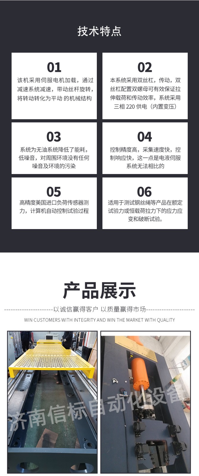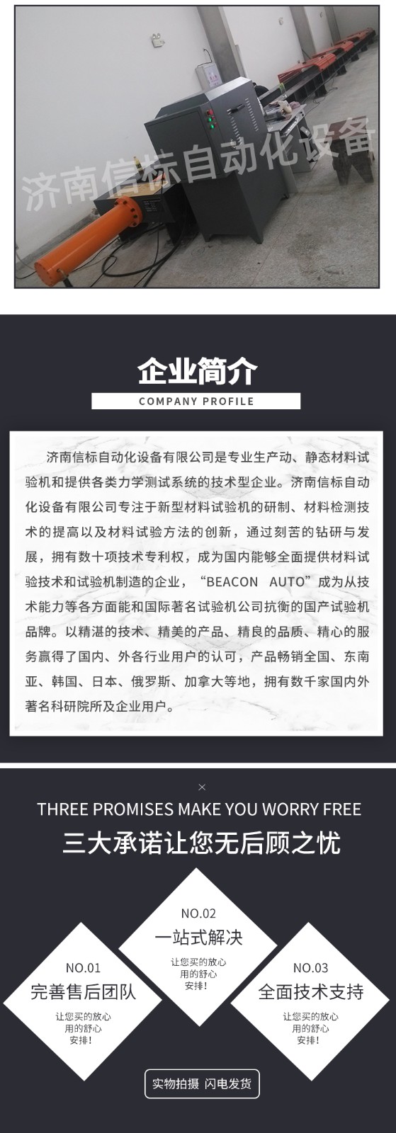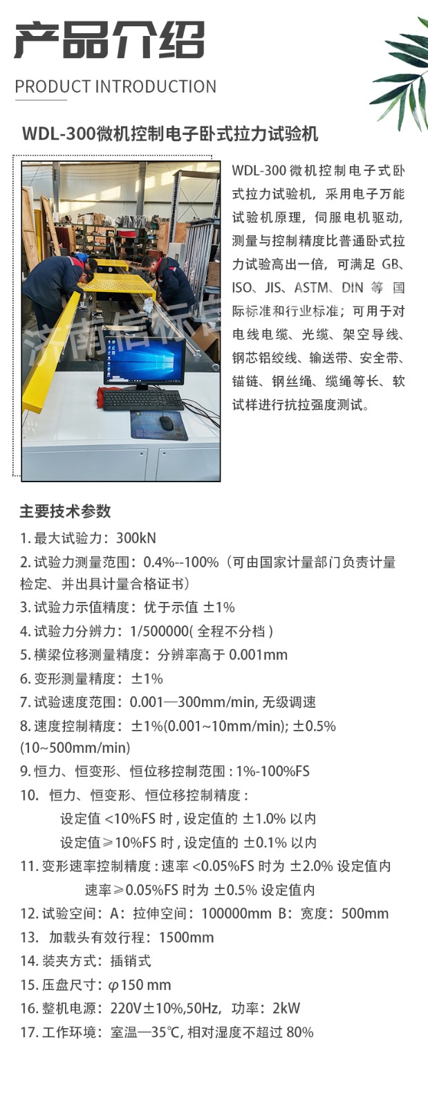 試驗標準: GB/T 8358-2014 鋼絲繩實際破斷拉力測定方法 GB∕T 1179-2008 圓線同心絞架空導線 DL/T 832-2003 光纖復合架空地線 DL/T 788-2001 全介質自承式光纜 GB/T 7424.4-2003 光纜 第4部分:分規(guī)范 光纖復合架空地線 IEC 60794.4-2009 光纜 第4部分:分規(guī)范 輸電線架空光纜 IEEE 1138-2009 電力事業(yè)用電線的復合光纖架空地線的建造標準 GB/T16491-2008 電子式萬能試驗機 GB/T228.1-2010 金屬材料室溫拉伸試驗 GB/T4909.3-2009 裸電線試驗方法 第3部分:拉力試驗 GB/T14049-2008 額定電壓10KV架空絕緣電纜 GB/T12527-2008 額定電壓1KV及以下架空絕緣電纜 GB/T3955-2009 電工圓鋁線 GB/T17048-2009 架空絞線用鋁線 GB/T17939-2009 電工用鋁包鋼線 GB/T3428/2012 架空絞線用鍍鋅鋼線 三、主要技術指標: 1. 最大試驗力:300kN 2. 試驗力測量范圍:0.4%--100% (可由國家計量部門負責計量檢定、并出具計量合格證書) 3. 試驗力示值精度:優(yōu)于示值±1% 4. 試驗力分辨力:1/500000(全程不分檔) 5. 橫梁位移測量精度:分辨率高于0.001mm 6. 變形測量精度:±1% 7. 試驗速度范圍:0.001—300mm/min,無級調速 8. 速度控制精度:±1%(0.001~10mm/min); ±0.5%(10~500mm/min) 9. 恒力、恒變形、恒位移控制范圍: 1%-100%FS 10.恒力、恒變形、恒位移控制精度: 設定值<10%FS時,設定值的±1.0%以內 設定值≥10%FS時,設定值的±0.1%以內 11. 變形速率控制精度: 速率<0.05%FS時為±2.0%設定值內 速率≥0.05%FS時為±0.5%設定值內 12. 試驗空間: A:拉伸空間:100000mm B:寬度:500mm 13.加載頭有效行程:1500mm 14. 裝夾方式:插銷式 15. 壓盤尺寸:φ150 mm 16. 整機電源:220V±10%,50Hz,功率:2kW 17. 工作環(huán)境:室溫—35℃,相對濕度不超過80%